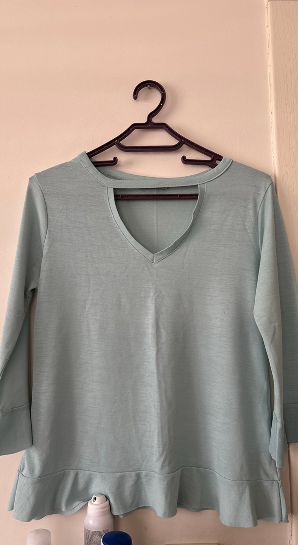 V yaka ve uzun kollu, bol kesim hamile bluzu. Yumuşak keten benzeri kumaştan, sade ve normcore tarzda, günlük kullanıma uygun açık bej renkte.