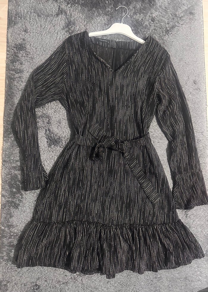 Etek pile detaylı kısa elbise. Siyah ve gri desenli, V yakalı, belde bağlama ipi ile günlük kullanıma uygundur