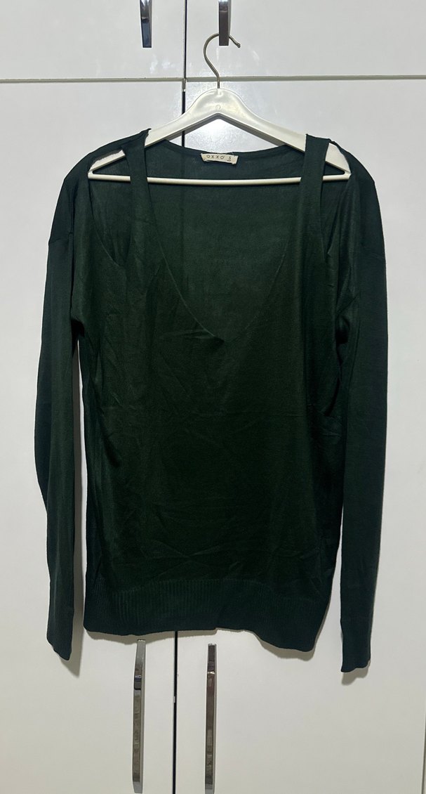 Yeşil renkte, V yakalı ve uzun kollu kadın kazak. Sentetik kumaştan üretilmiş, midi boyda ve bol kesimle minimalist goth tarzını yansıtıyor.