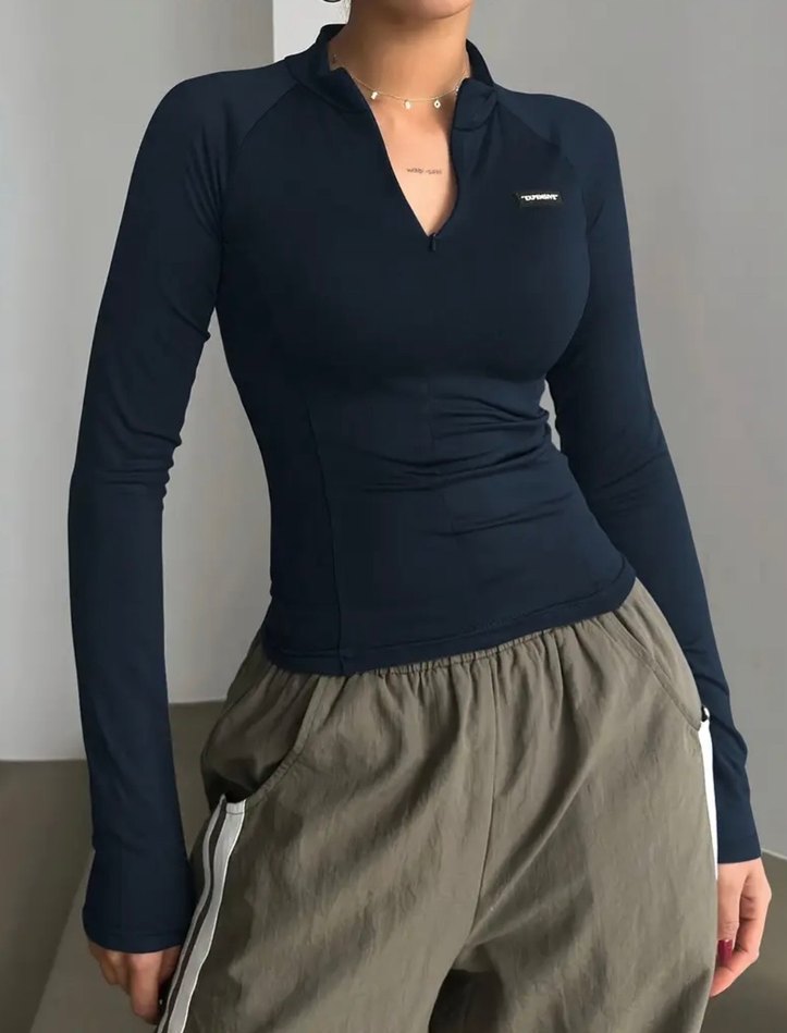 V yakalı, uzun kollu ve vücuda oturan kadın spor üstü, koyu gri renkte sentetik kumaştan üretilmiştir. Günlük kullanıma uygun, rahat ve şık bir sokak giyimi parçasıdır.