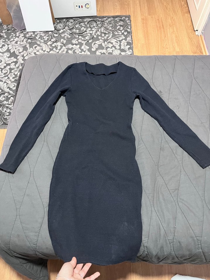 V yaka ve uzun kollu, vücuda oturan kadın triko elbise. Yumuşak sentetik kumaştan, koyu gri renkte, minimalist normcore tarzında, günlük kullanıma uygun. ✨