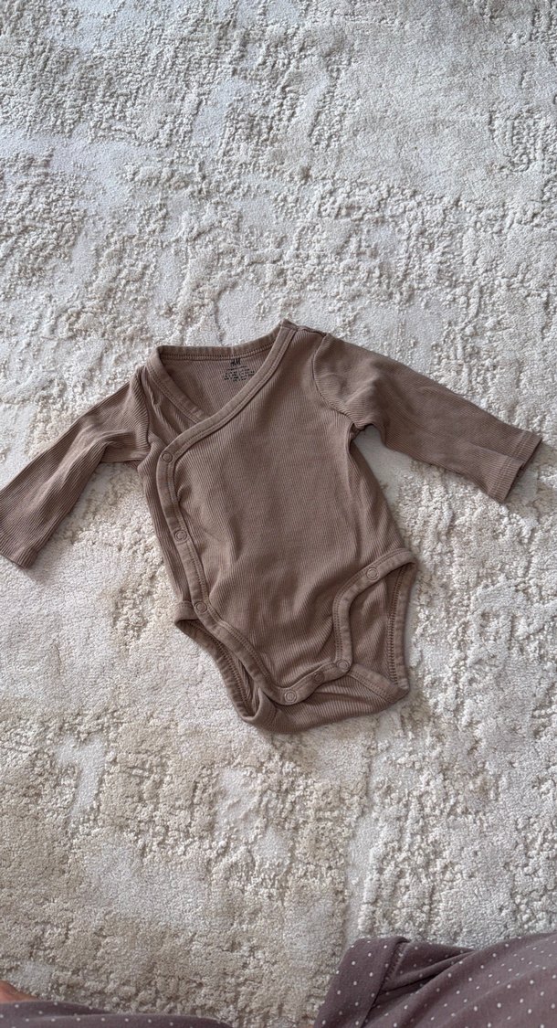Uzun kollu ve V yakalı kahverengi bebek body, desensiz sade tasarımıyla zahmetsiz şıklık sunar.