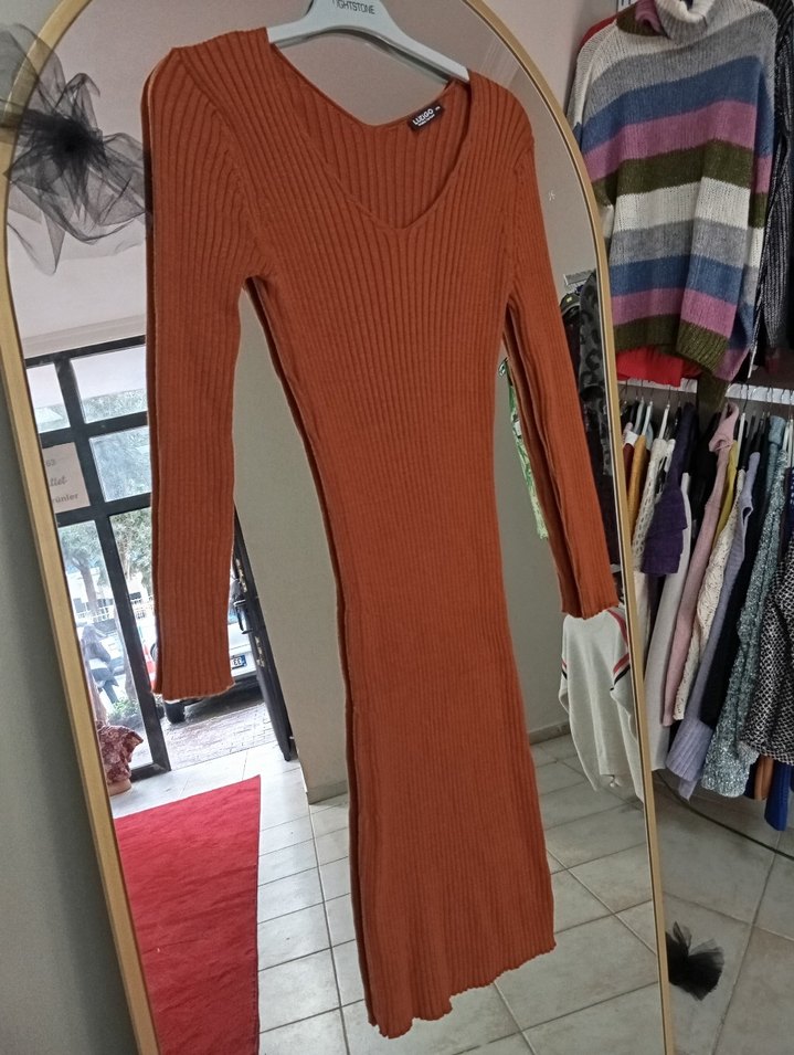 V yaka ve uzun kollu, kahverengi triko kumaştan yapılmış, vücuda oturan uzun elbise. Desensiz sade tasarımı günlük kullanıma uygundur.