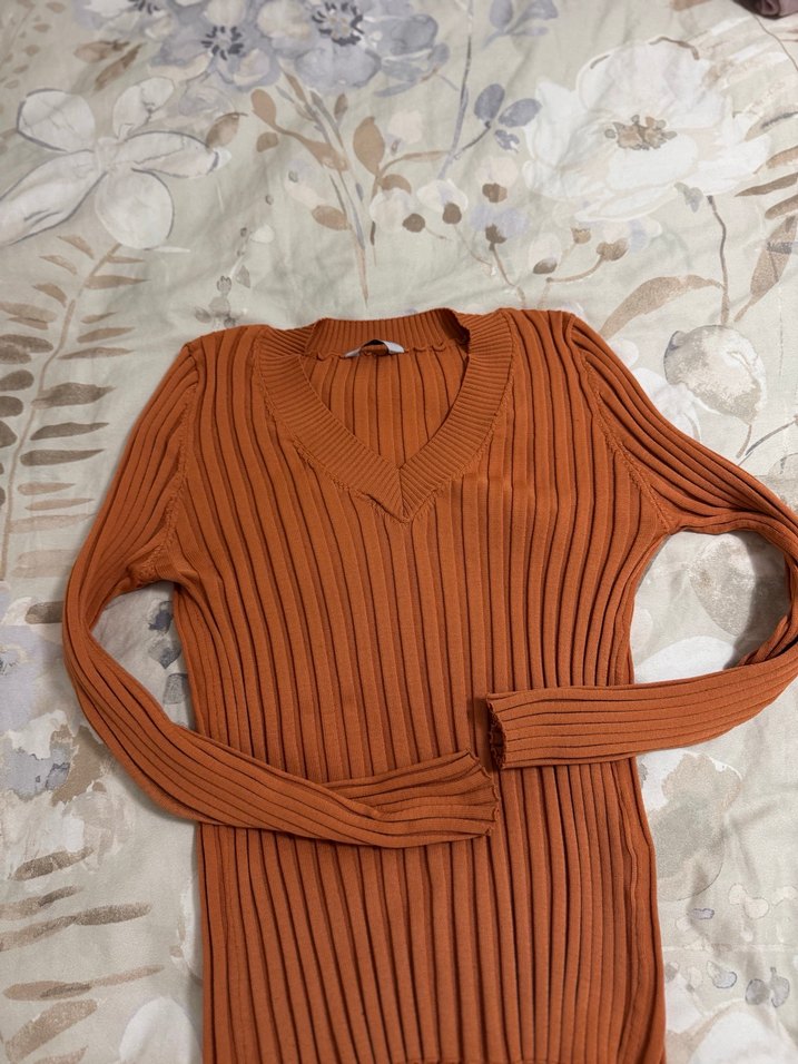 V yaka, uzun kollu, kahverengi triko kazak, günlük kullanıma uygun, rahat ve desensiz, normal midi boyda.