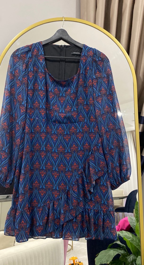 Mavi uzun elbise, V yaka ve uzun kollu, bol kesimdir. Baskılı deseni ve fırfır detaylarıyla bohem stilde, günlük kullanıma uygundur.