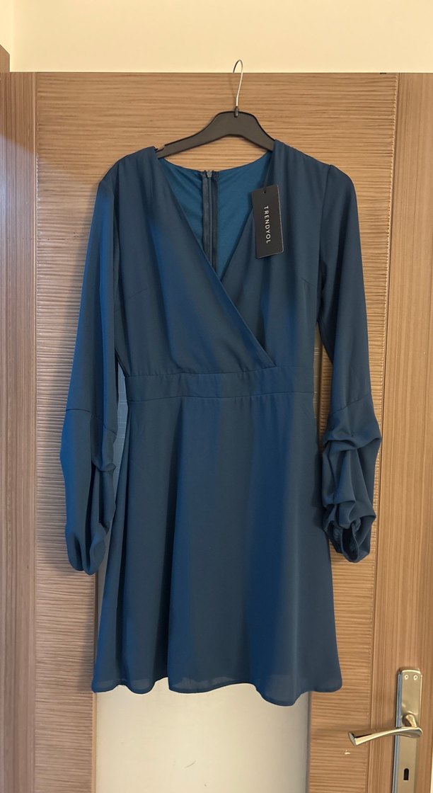 Koyu mavi elbise, V yaka ve uzun kollu. Rahat kesimli, drapeli tasarımıyla ofis için uygun. ✨