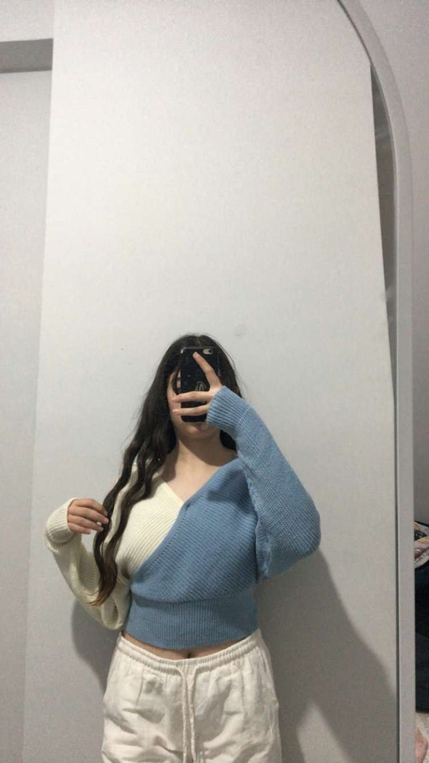 V yaka, uzun kollu ve midi boyda olan bu triko kazak, yumuşak mavi örme kumaştan yapılmıştır. Rahat ve gündelik kullanıma uygundur. butikten aldim