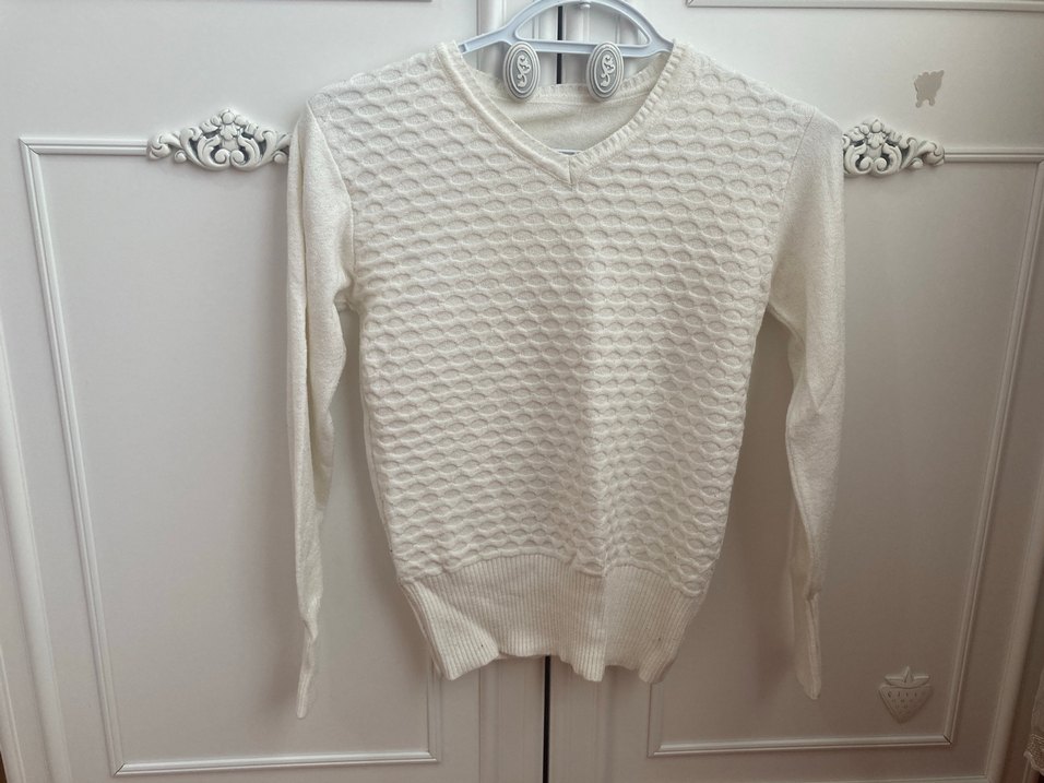 V yaka ve uzun kollu, örgü dokulu beyaz kadın kazak. Fitted kesimiyle rahat ve şık, günlük sokak stiline uygun.s beden ama gobek yoksa m beden de olur