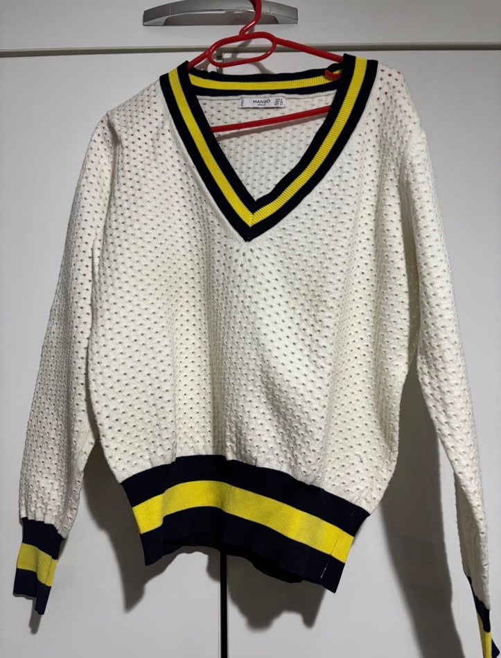 V yaka ve uzun kollu, beyaz örgü kazak. Manşet ve etek kısmında sarı ve siyah çizgiler bulunur. Salaş kesimli, günlük ve sokak stiline uygun.