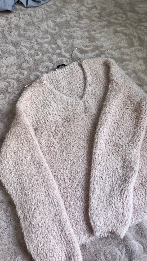 V yaka, uzun kollu, peluş detaylı bej kazak