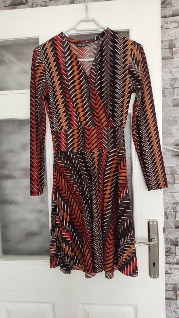 V yaka ve uzun kollu, pilili dokulu, koyu renkli çok desenli bohem elbise. Sentetik kumaştan, günlük kullanıma uygun. marka temsili