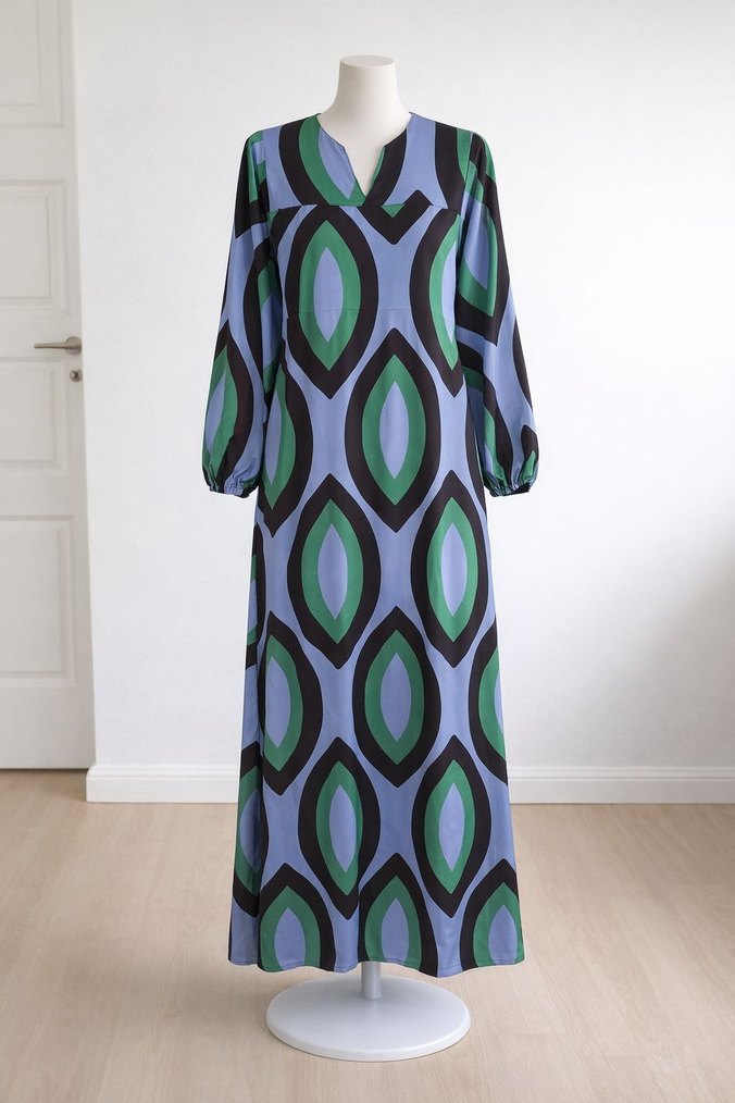 Uzun, bol kesim elbise, drapeli tarzda ve koyu çok renkli retro batik desenlidir. Uzun kollu, V yakalı ve yumuşak sentetik kumaştan yapılmıştır.