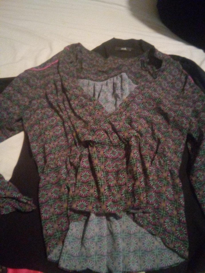 Uzun kollu, salaş kesim ve drapeli tasarıma sahip kadın bluz. V yaka ve koyu çok renkli deseniyle günlük kullanıma uygundur.