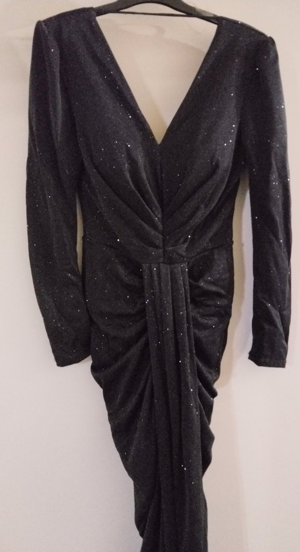 V yaka ve uzun kollu, drapeli tasarıma sahip siyah, vücuda oturan abiye elbise. Parlak detaylarla parti şıklığı sunar. ✨