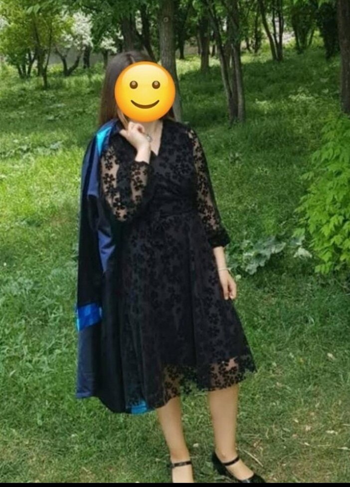 Uzun kollu, V yakalı siyah midi mezuniyet elbisesi. Salaş kesim, drapeli ve koyu renkli batik desenlidir. Gotik ve bohem tarzları bir arada sunar. bir kaç kez giyildi.