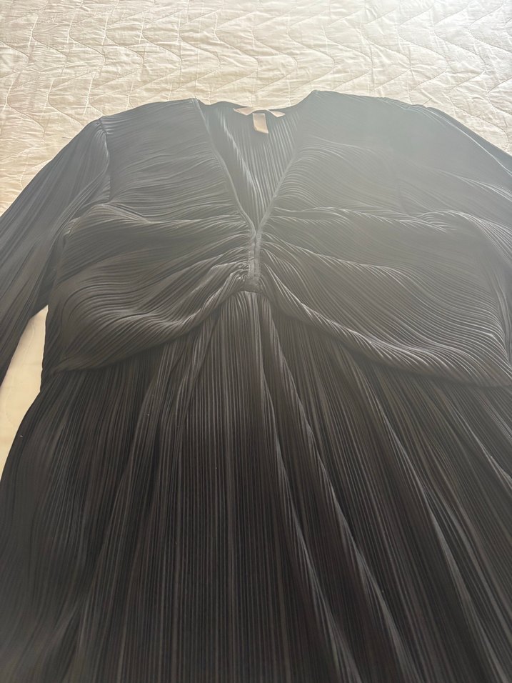 Bu siyah uzun elbise, V yaka, uzun kollu ve pilili sentetik kumaştan olup, gotik tarzda romantik akşamlar için uygundur.