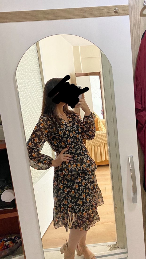 V Yaka Uzun Kollu siyah-turuncu Çiçekli Bohem Elbise