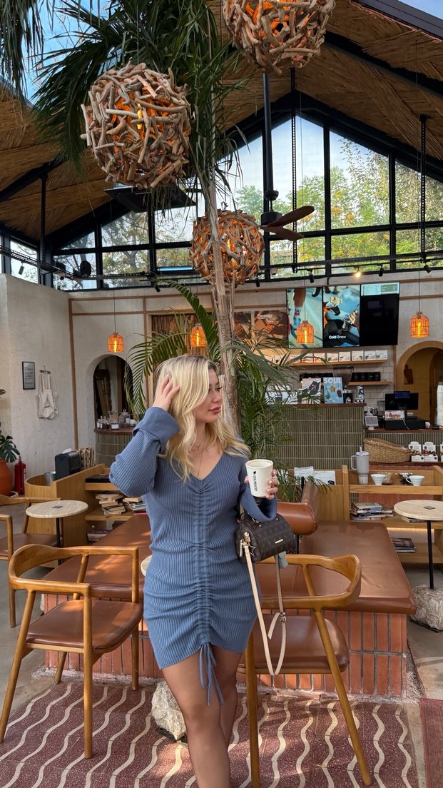 V yakalı ve uzun kollu, triko kumaştan mini elbise. Camel ve gri tonlarında batik desenli, sıkı oturan rahat ve şık bir model.