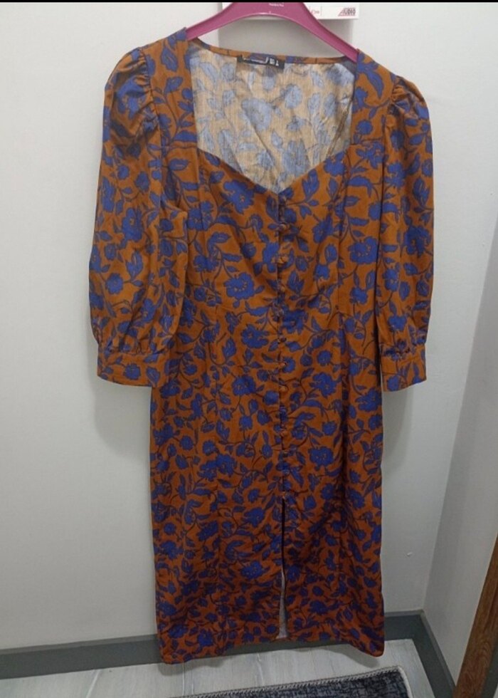 V yaka ve uzun kollu, sentetik kumaştan yapılmış, kahverengi ve mavi batik desenli, dar kesim uzun elbise. Drapeli tasarımıyla vintage bohem tarzını yansıtıyor.