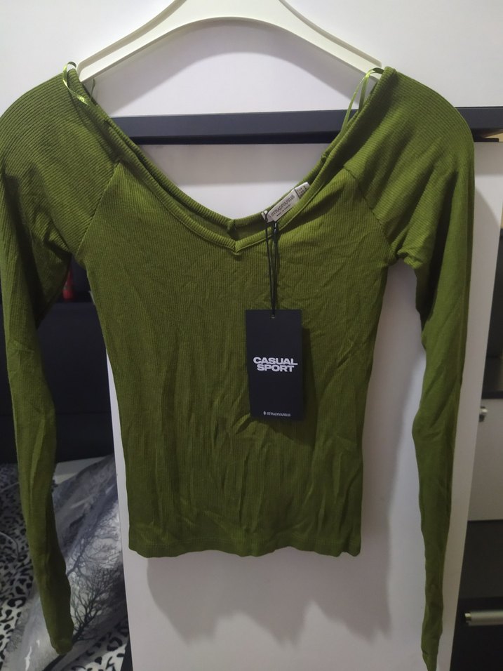 V yaka, uzun kollu, sıkı kesim, koyu yeşil renkli triko kazak. Kısa boyda ve desensiz, günlük kullanıma uygun.