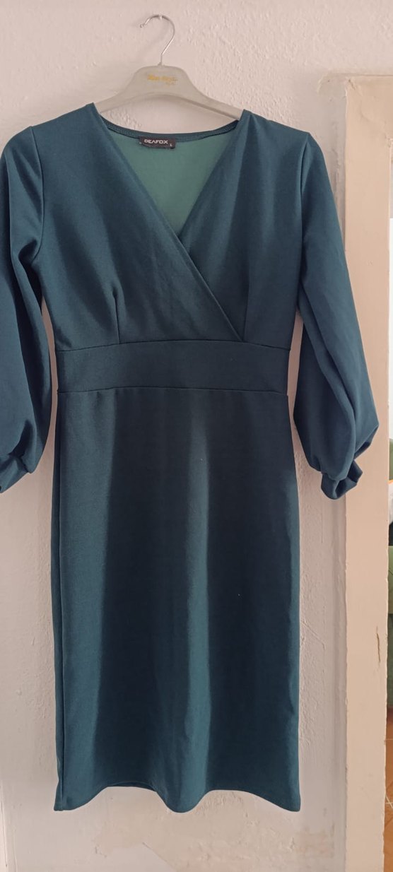, V yakalı, uzun kollu ve dar kesim zümrüt yeşili uzun elbise, modern klasik ofis şıklığı için uygundur.