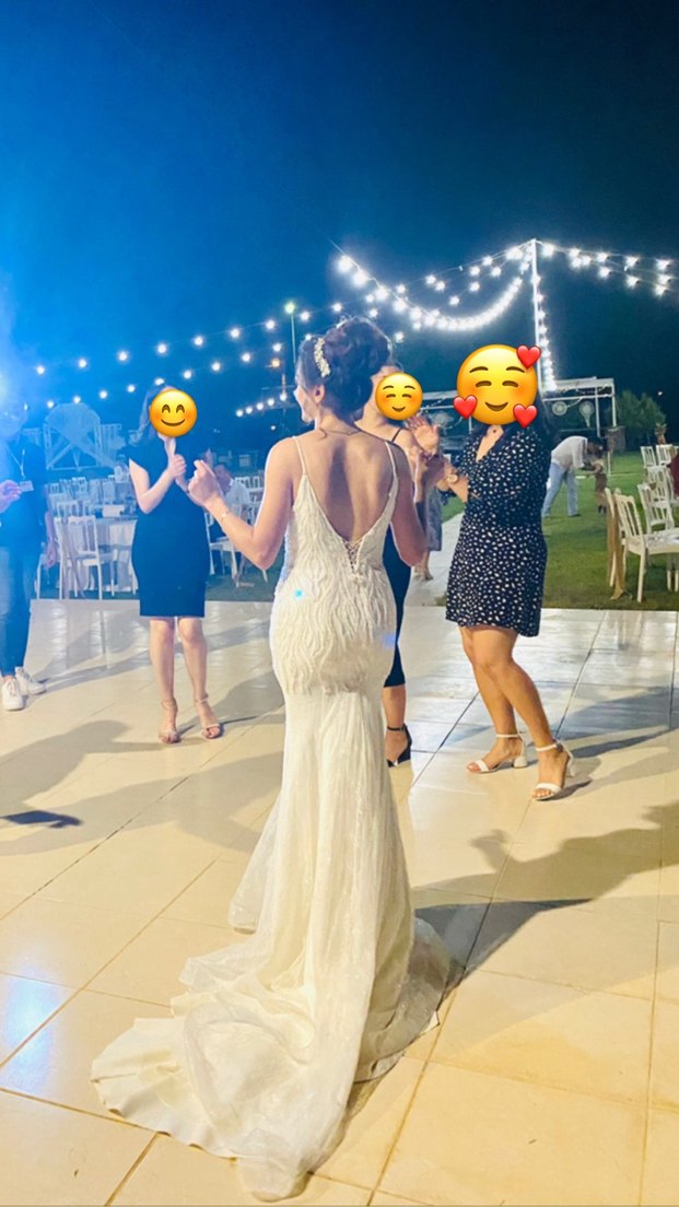 V yakalı, askılı beyaz denizkızı gelinlik, uzun kuyruklu ve şık bir tasarıma sahip, gösterişli düğünler için ideal. Çok severek sadece düğünümde ve dış çekimimde giydim. Fiyat sorunuz