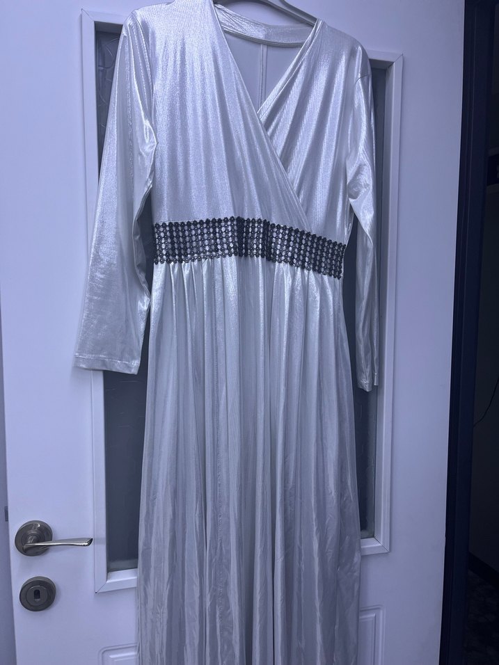 V yaka, pilili ve bol kesim beyaz uzun abiye elbisedir. Askılı kollara ve belde süslemeye sahiptir, düğünler için uygundur. 40 bedene göre dikildi