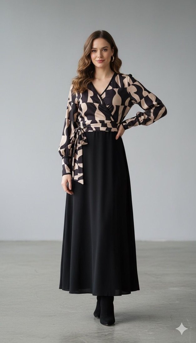 V yakalı, uzun kollu ve bol kesimli siyah uzun elbise. Üst kısmında drapeli bağlamalı desenli tasarım bulunur, ofis için uygundur.