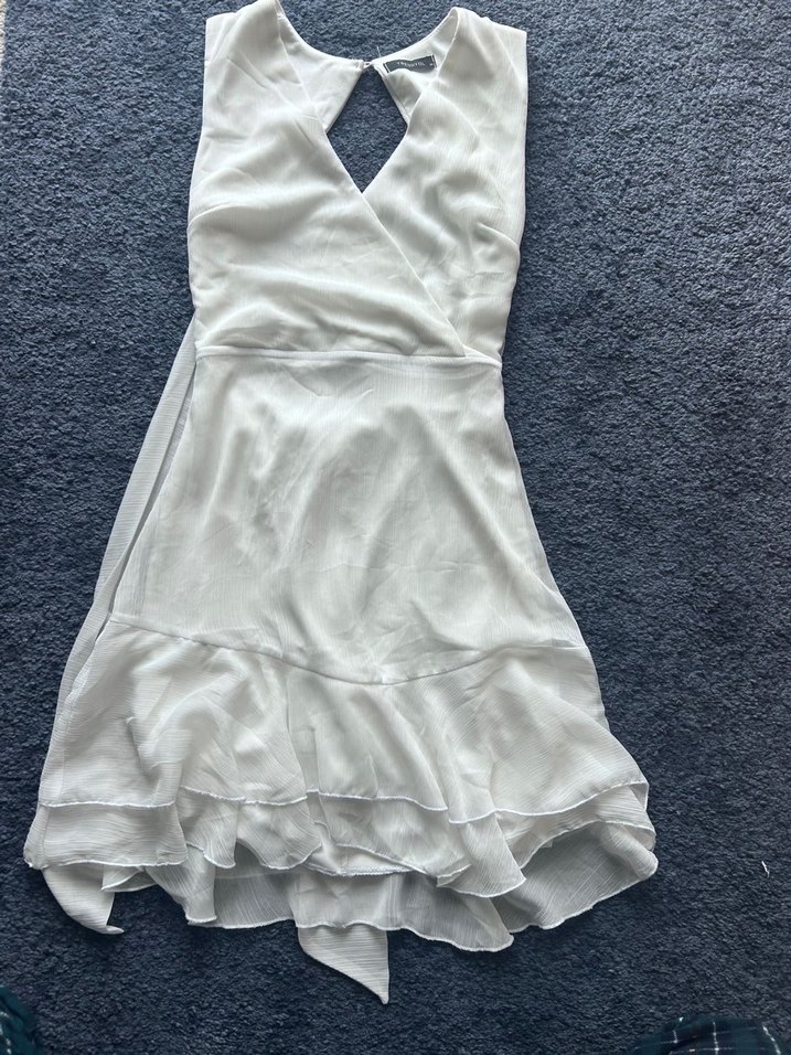 Kolsuz, V yakalı, volan detaylı beyaz midi elbise. Bohem tarzda, düğünler için uygun, vücuda oturan kesim.