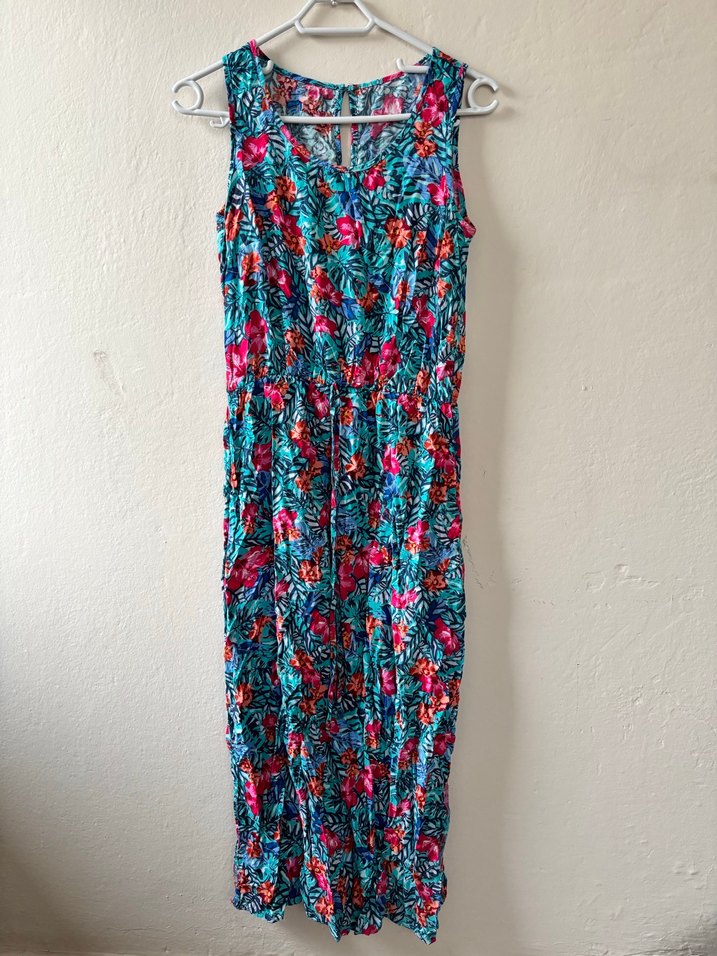 38-40 beden uyumlu. Renkli çiçek desenli, kolsuz, bohem tarzda, V yakalı uzun elbise. Yumuşak tekstil kumaştan, vücuda oturan kesimle. Yaz aylarında kullanım için ideal. Yakasında ufak bir sökük mevcut.