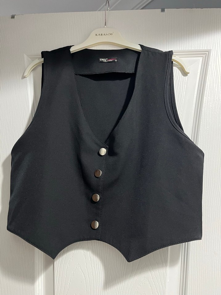 Siyah, düğmeli, kolsuz ve V yaka yelek sıfır hiç giyilmedi hediye geldi ancak giymedim sorunu yoktur çektiğim 3. Fotoğrafta düğmesinde hafif soyulma olmuş sıkıntı değil yine de belirtmek istedim