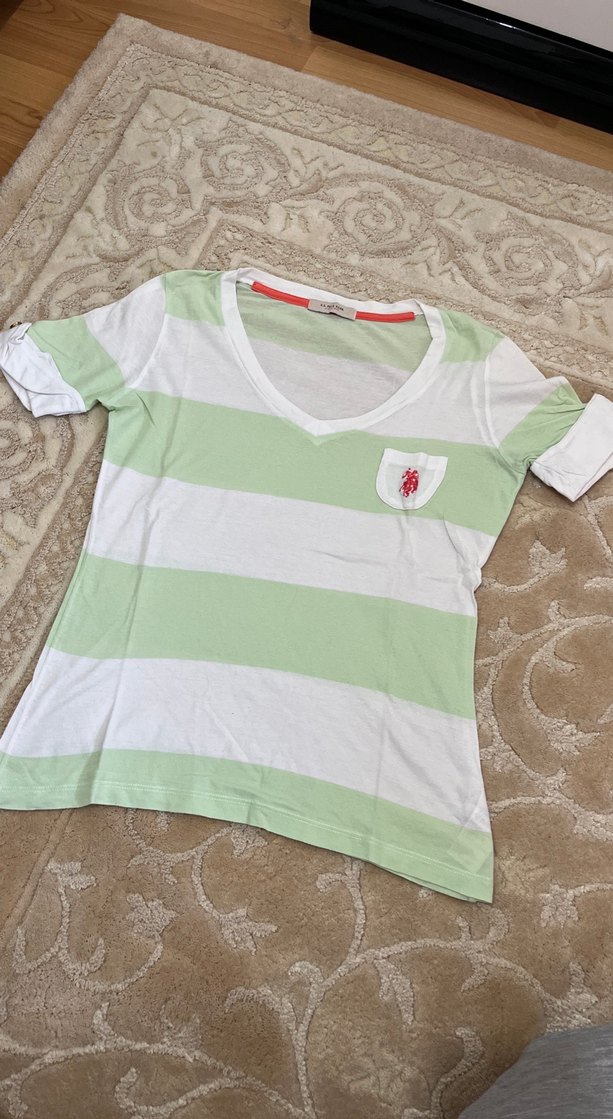 Kısa kollu, V yaka, yeşil ve beyaz çizgili pamuklu kadın tişörtü. Rahat kesimi ve küçük göğüs cebindeki detayla günlük sokak stiline uygun.
