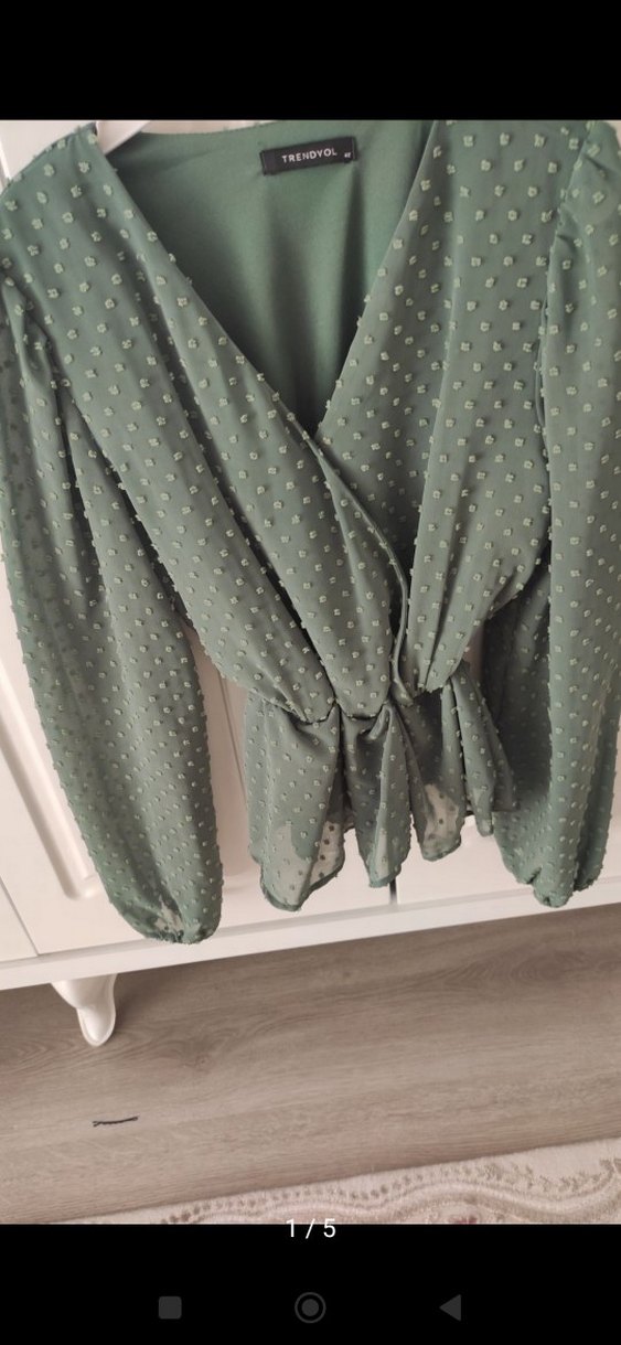 ben de uygulamadan aldım ama dar geldi bı kez tek kullandım ama yaka kısmına iğne takmıştım açılıyor diye iz yapıp hafif söküldü. siz dikerek ya da iğne takarak kullanabilirsiniz o yüzden uygun fiyata koyuyorum boydan 58 santim ,iki koltuk arası kırk altı santim ama önü açık olduğu için kesin bir ölçü değil kırk kırk iki bedene olur #bluz#trendyolbluz