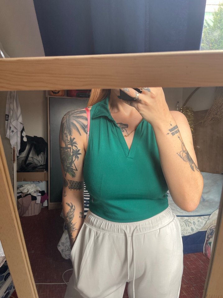 Bu yeşil, kolsuz crop top, V yaka ve normal boyda, rahat sokak stili için pürüzsüz sentetik kumaştan üretilmiştir.