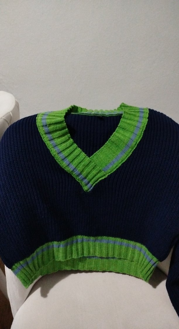 V yaka, uzun kollu, fitted kesim kadın triko kazak. Renkli yeşil detaylı, rahat örme kumaştan, günlük kullanıma uygun. 1 kere giydim kolları uzun geliyor diye satıyorum