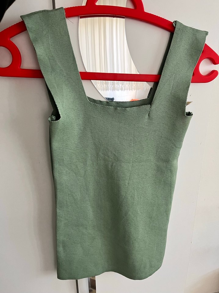 V yaka, yeşil renkli, kolsuz ve vücuda oturan midi uzunlukta kadın atlet, rahat sentetik kumaştan, günlük sokak stiline uygun.