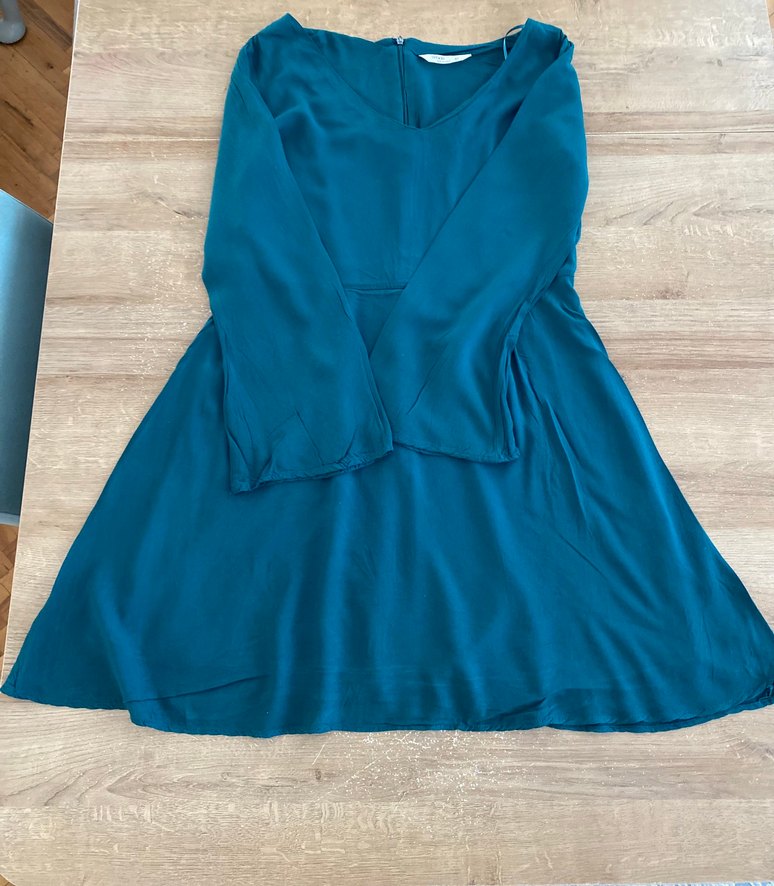 Yeşil diz boyuelbise, bol kesim, V yaka ve uzun kolludur. İpeksi kumaştan, drapeli tasarıma sahiptir ve romantik şık bir elbisedir