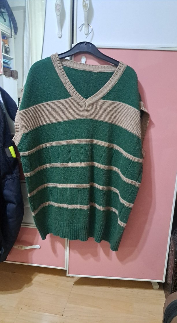 V yaka, kolsuz, yeşil ve gri çizgili örme kadın süveter. Rahat kesimiyle günlük sokak stiline uygun. tüylenme var