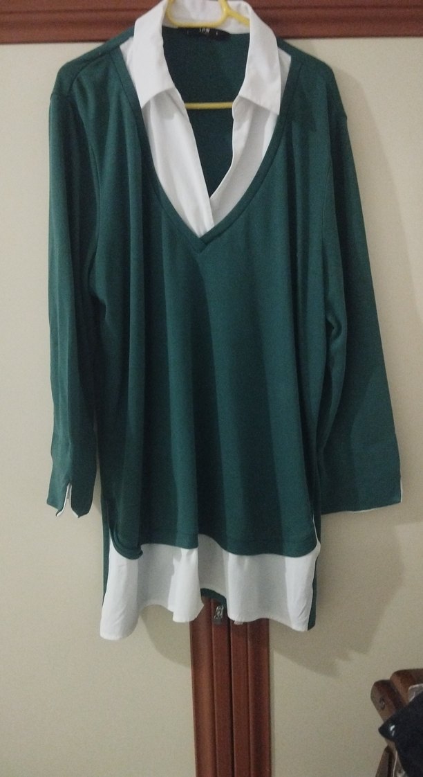 Uzun kollu, V yakalı koyu yeşil midi tunik. Bol kesimli, dökümlü ve beyaz etek ucu detaylıdır. Günlük kullanıma uygun sentetik kumaştan yapılmıştır.
