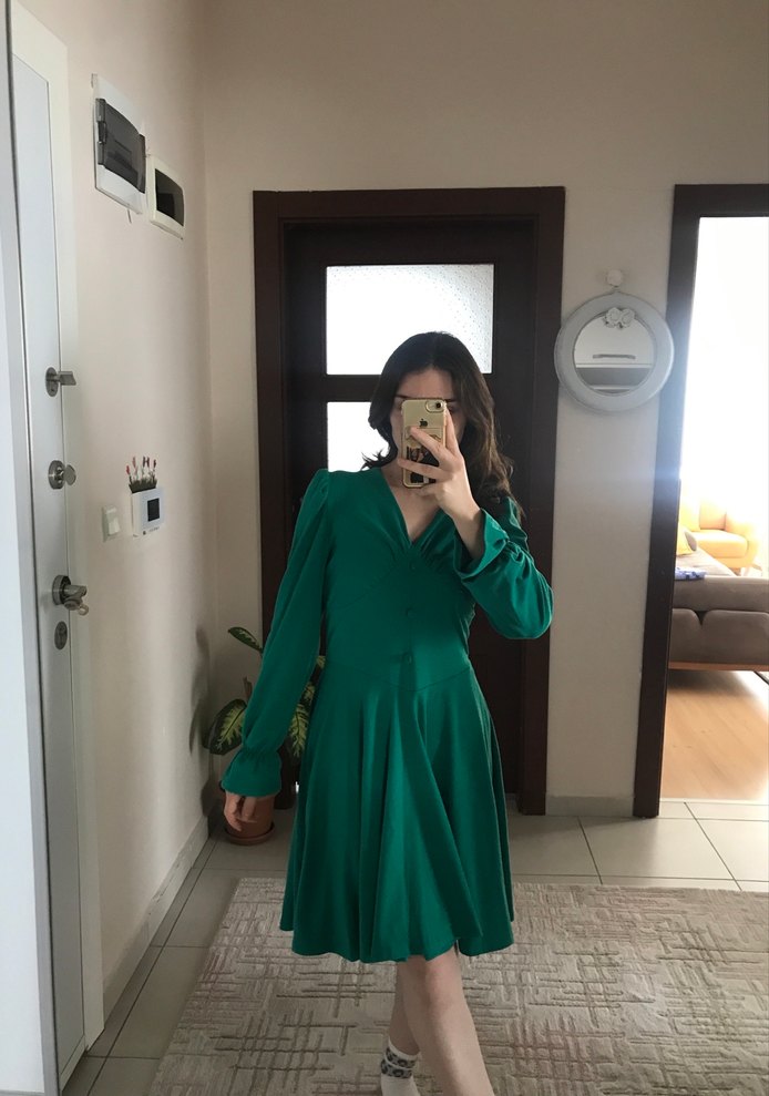 Bu kadın midi elbise, salaş kesim, drapeli V yakası ve uzun kollu tasarımıyla öne çıkar. İpek gibi parlak yeşil kumaştan üretilmiştir ve sokak tarzına uygundur.