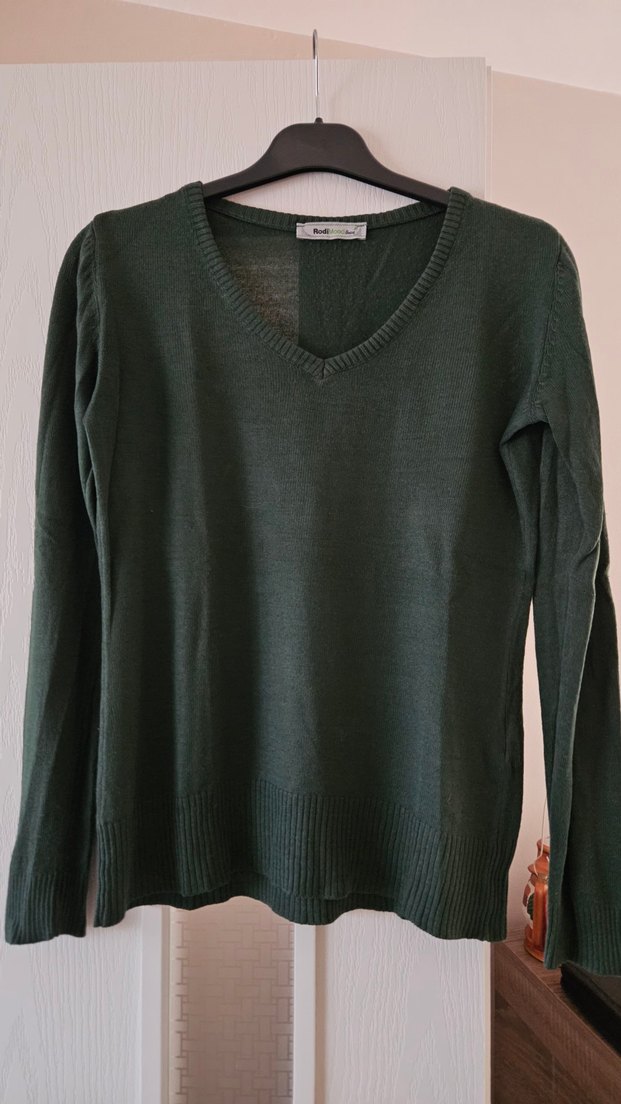 V yaka, uzun kollu, yeşil triko kadın kazak, rahat ve sade tasarımıyla günlük kullanıma uygundur.
