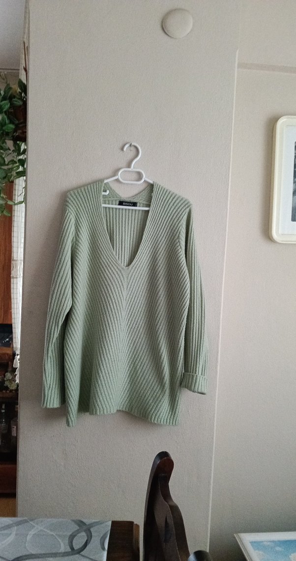 V yaka ve uzun kollu, yumuşak triko kumaştan yapılmış, pastel yeşil renkli, bol kesim ve normal boyda kadın kazak. Günlük kullanım için uygundur.