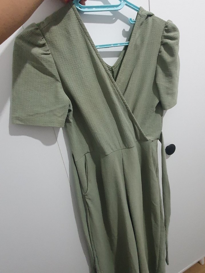 Yeşil renkli tulum, V yaka ve bol kesimle drapeli detaylara sahip. Kısa kollu, yumuşak ve nefes alabilir kumaştan, günlük kullanıma uygun.