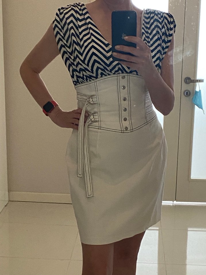 V yaka, ince askılı, beyaz kot kumaştan zebra desenli, beli kuşaklı, midi boy kalem elbise. Ofis için modern ve şık bir seçim.