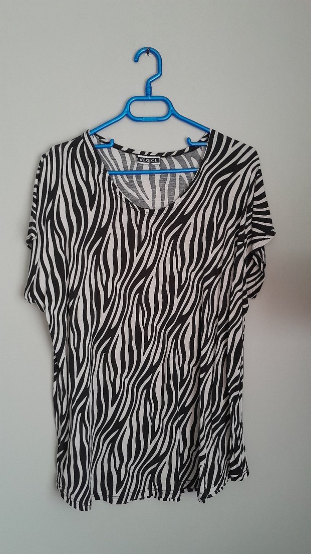 V yaka, kısa kollu, bol kesim kadın tişörtü. Gri ve beyaz zebra desenli, pilili sentetik kumaştan, günlük rahat sokak stili için uygun.