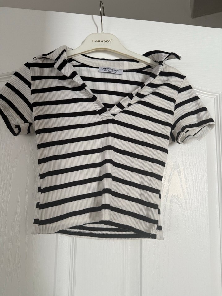 V yaka, kısa kollu, zebra desenli beyaz-gri kadın tişörtü. Pliseli sentetik kumaştan, kısa boyda, rahat ve şık günlük kullanım için uygun.hiç kullanılmadı