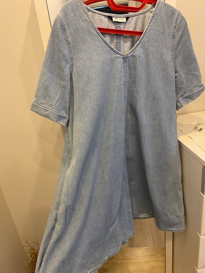 V Yakalı Asimetrik Kesim Mavi Kot Elbise
