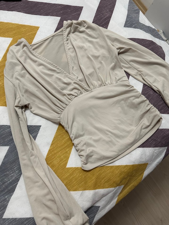 Bej renkli, V yakalı ve uzun kollu bu bluz, drapeli tasarımı ve midi boyuyla trend bir günlük şıklık sunar.