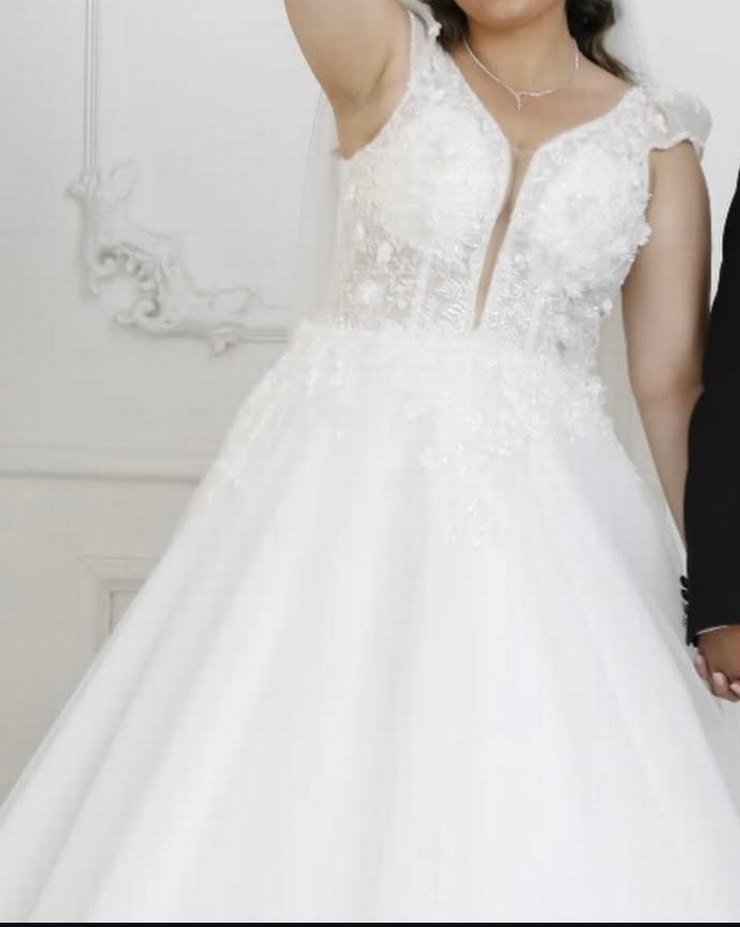Uzun beyaz A kesim gelinlik, V yakalı ve kolsuz tasarımıyla klasik ve modern Paris tarzını birleştirir. kesimdir.