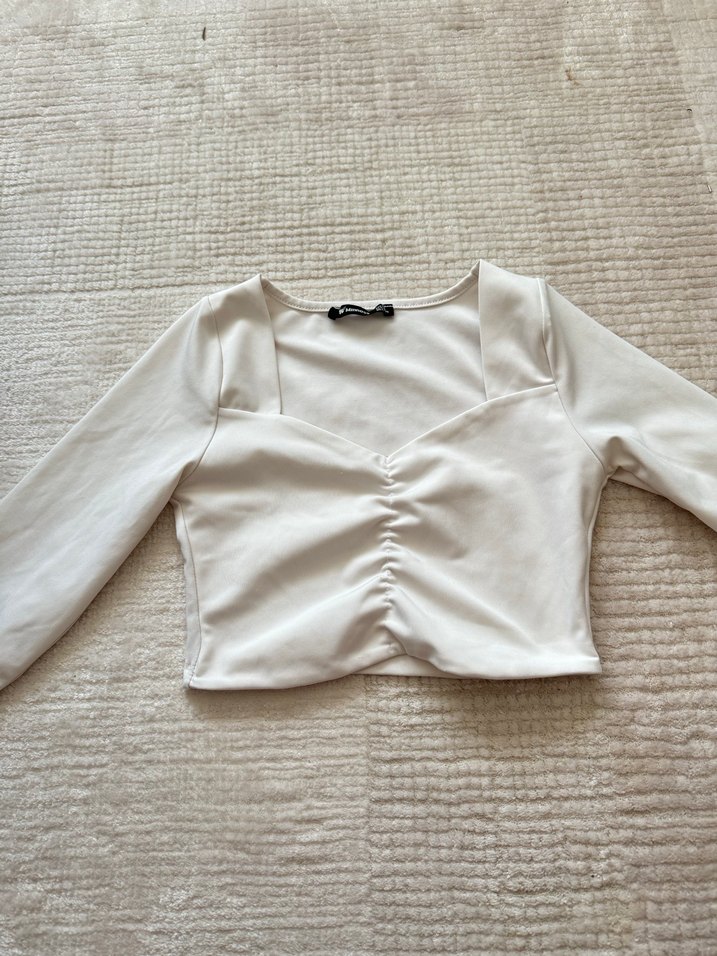 Beyaz, düğmeli, V yakalı kadın bluz, uzun kollu ve vücuda oturan kesime sahiptir. Yumuşak keten kumaştan yapılmış, normal midi boyda, desen içermeyen sade ve minimalist tasarım. Defosuz